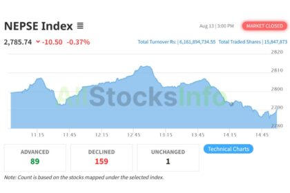 The NEPSE Index ended lower on Tuesday, August 13, closing at 2,785.74, down 10.50 points…