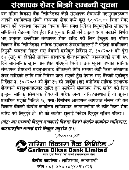 Garima Bikas Bank Limited has announced the sale of 98,028.84 units of promoter shares, now open for public purchase.
