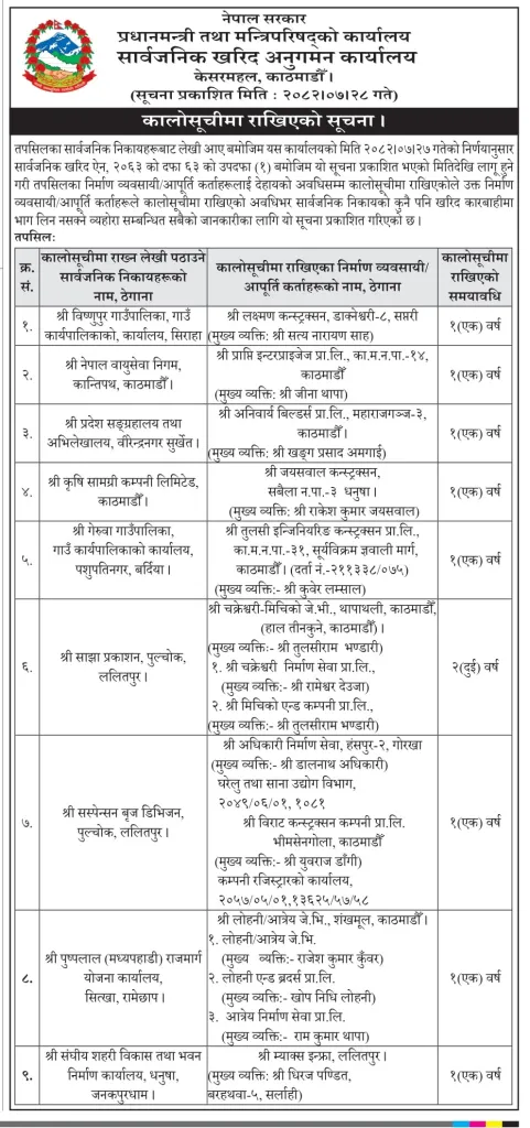 According to the office, these companies and individuals have been blacklisted for 1 to 2 years because they violated agreements with public bodies, made serious mistakes in construction and supply, failed to complete work as per contracts, or did not respond to government requests.