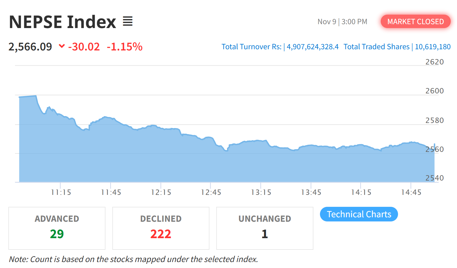 The Nepse index continued to decline throughout the day. It opened at 2,598.4 points and dropped 30.02 points, or 1.15%, to close at 2,566.09 points.