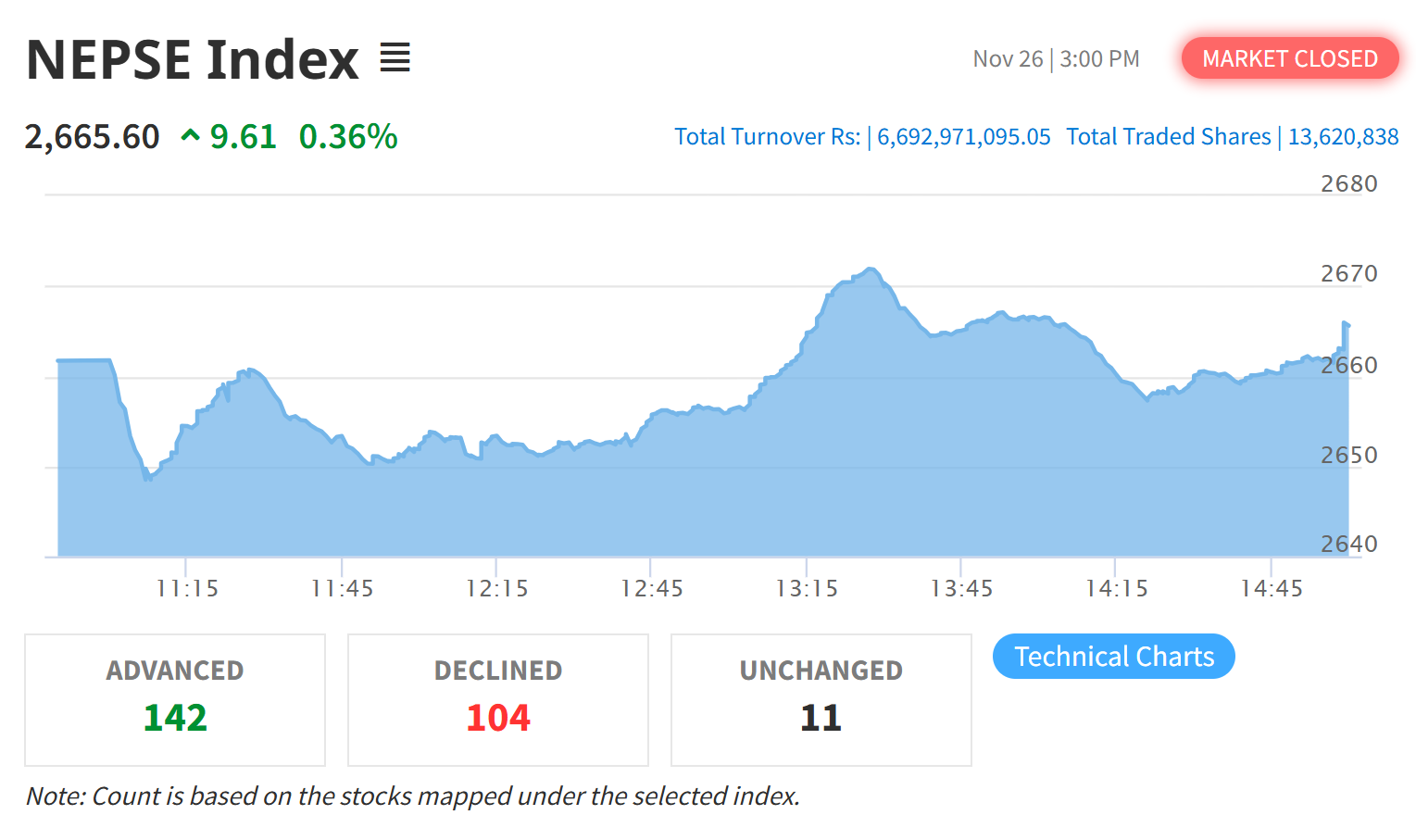This is the fourth day in a row that the market has gone up. In the last four days, the NEPSE index has gained a total of 105 points. NEPSE, which was at 2560 points last Thursday, has now reached 2665 points. The trading amount also increased. On the previous day, the market had a turnover of 5.82 billion rupees, and today it reached 6.69 billion rupees.