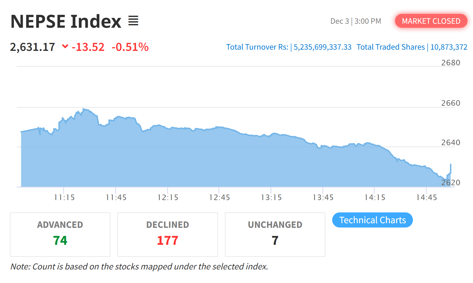 The market has been slipping since Sunday. With today’s drop of 13 points, the NEPSE index has now fallen to 2631 points. However, even though the market went down, the trading amount surprisingly increased. On the previous day, transactions totaled Rs 4.48 arba, but today it jumped to Rs 5.23 arba.